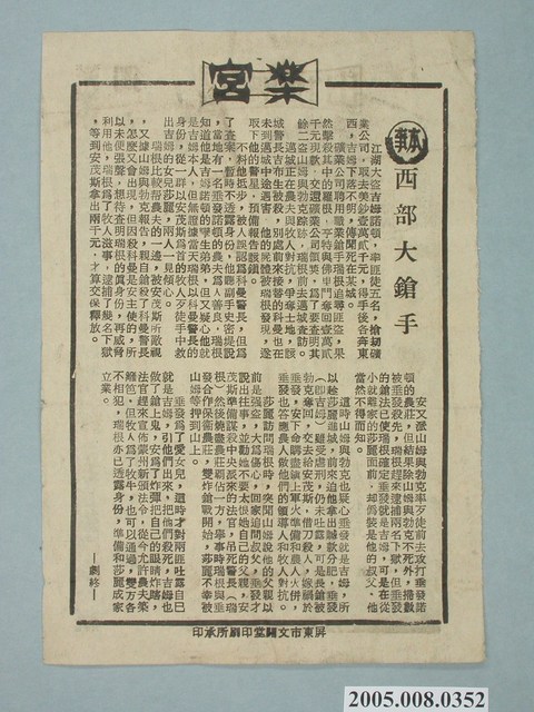本件保存情況良好,為雙面印刷。播放的戲院為樂宮戲院。其餘部分為電影西部大槍手。一名強盜果多(Gordo)從監獄釋放了一群囚犯,他脅迫他們加入他的團隊或死亡。亞歷桑納.柯特(Arizona Colt)兩件事情都不願意做,於是亞歷桑納前往黑石城,一處果多正計劃搶劫的地方。 當果多的手下謀殺一名沙龍的女孩朵洛莉絲(Dolores)時,亞歷桑納以五百美元協助朵洛莉絲的妹妹珍追捕殺姐兇手。由裘林諾.傑馬(Giuliano Gemma)、羅貝多.加馬迪爾(Roberto Camardiel)主演。