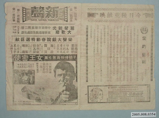 1.本物件為新聲戲院宣傳單,紙質文物。該宣傳單正面全版皆為「黃宝石」宣傳廣告,該片導演為「希區考克」,主演為「佛烈德史達福」、「丹娜露薇」、「約翰范濃」。背面左方可見「新聲」、「麗聲觀光大歌廳」、「7號情報員第6集 女王密使」宣傳廣告,右側為「愛的藝術」劇情介紹、「PRIMOVLAR 安無姙P口服避孕片」廣告。