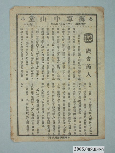 1.本物件為海軍中山堂宣傳單,紙質文物。該宣傳單上方可見「佳片預告」字樣,中間為「白衣紅淚」宣傳廣告,下方為「仙境幻舞」宣傳廣告以及觀眾注意事項。兩側為「即說即做 實情實報」、「不發牢騷 不誤時間」標語。背面上方為「海軍中山堂」、「放映日期 十二月三十三一日 二天」、「BNo 160」字樣、下方為「廣告美人」劇情介紹。
