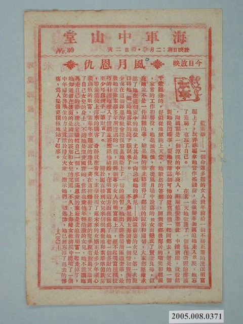 本件保存情況尚可,為雙面印刷。播放的戲院為海軍中山堂。其餘部分為電影梁紅玉、風月恩仇。在世紀之交繁忙的都市紐約,花花公子查利.希爾(Charlie Hill)墜入了愛河,他的對象是美麗的安潔拉.彭菲爾斯(Angela Bonfils),她工作於紐約的包里(Bowery)街。 為了獲取愛人的芳心查利承諾改變他以往的放蕩生活,甚至試圖好好安份地工作。由弗雷.亞斯提爾(Fred Astaire)、維拉.艾倫(Vera-Ellen)主演。