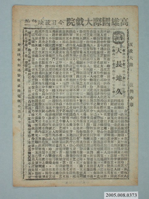 本件保存良好,為單色印刷,為電影戰鼓震山河廣告單。由詹姆斯克萊格、基麥迪遜、巴巴拉波頓主演,導演為屠光啟。電影單其他部分為電影天長地久(1952)與電影人海奇女子(1952)