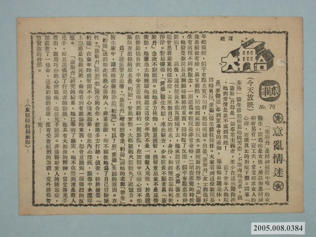 本件保存良好,為單色印刷,為電影火山邊緣之戀廣告單。由殷格麗褒曼、羅瑟里尼主演。故事敘述居住在難民營Karen遇到一名士兵Antonio並與他結婚,後來他們搬到Antonio的家鄉,一座荒涼的火山島,但是Karen她卻不習慣這個島上的一切…。電影單其他部分為電影意亂情迷