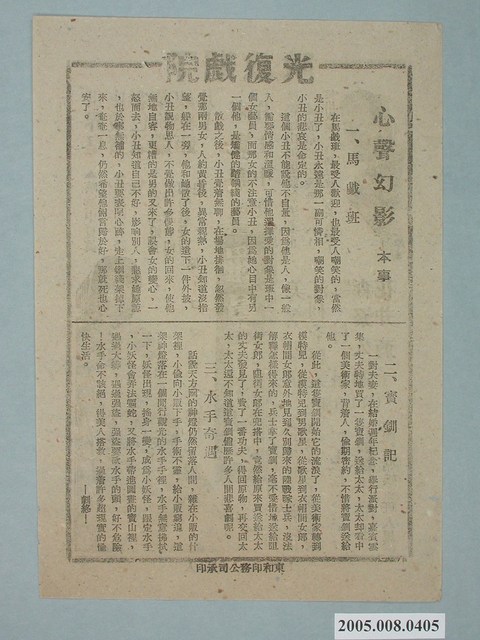 本文物為《羅曼斯姑娘》電影廣告單,由美空雲雀、江利千惠美、雪村泉、森繁久彌、花井菊子主演,標題寫著「世界皇座東寶彩色豪華絢爛娛樂鉅片!」、「笑料如山洪暴發無法遏止」以及「淘氣姑娘原班人馬」等字樣。背面為《心聲幻影》本事,講述電影的故事情節內容。由東璧印務局承印。當時光復戲院的電影廣告宣傳單。