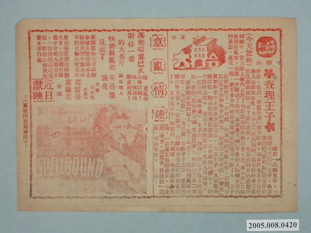本件保存良好,為單色印刷,為電影黑魔王廣告單。故事描述一名魔法師為了愛情而使用他的力量向國王路易十五復仇的故事。電影單其他部分為電影查理王子、電影意亂情迷
