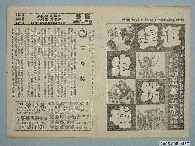 《賣身契》電影廣告單單張兩面,黑白印刷,外觀保存良好,紙張泛黃。 半面是《賣身契》本事、另半面是「追趕跑跳碰」簡介,黑色印刷。背面為《賣身契》電影宣傳折價券。 《賣身契》(Lola Montès (1955))。薜志文(許冠文飾)是鼠台電視訓練班學員,曾簽有一張空白的八年合約,因罕有出鏡機會,屢想跳槽,其弟薜志英(許冠英飾)為青年發明家,已製成遙控笑彈,能令人笑到不能自主。文於偶然機會中,在鄰台當節目主持,由於表現出色,大得經理賞識,欲與簽約,文因與鼠台有賣身契在先,唯有婉拒。文與鼠台經理談判解約未果,遂