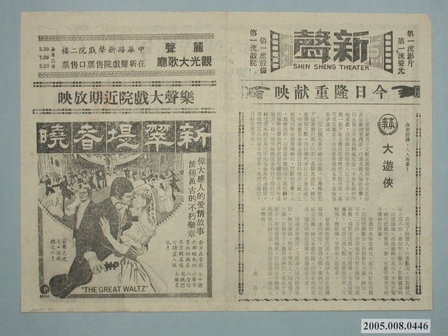 電影廣告單《小巨人》單張折頁雙面黑色印刷,外觀保存良好。封面為《新翠堤春曉》The great waltz電影宣傳,樂聲大戲院上映,上方為「麗聲觀光大歌廳」廣告,位於中華路新聲戲院二樓。 封底為《大遊俠》本事,新聲戲院上映,右側印有「保密防諜 人人有責」字樣。內頁為橫幅《小巨人》Little Big Man電影宣傳。 電影由 Dustin Hoffman、 Faye Dunaway、 Chief Dan George主演,導演Arthur Penn,1970年上映。