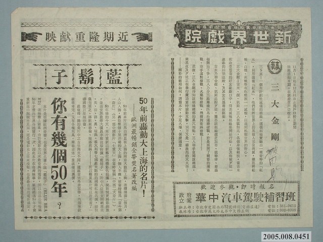 《藍鬍子》電影廣告單單張兩面,黑色印刷,外觀保存良好。 半面是新世界戲院「三大金剛」本事,有黑色原子筆記號、另半面是《藍鬍子》簡介。背面為《藍鬍子》電影宣傳。 《藍鬍子》(Bluebeard (1972))。一個第一次世界大戰的飛行員,每個人都羨慕為“嘲笑者”實際上是一個 - 在他撫養他追求的女人之後,他謀殺了他們。