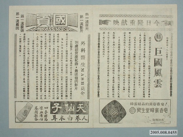 《外科醫生》電影廣告單單張兩面,外觀保存良好,黑色印刷,顏色有變淡。 半面是「巨國風雲」本事、另半面是國賓戲院《外科醫生》簡介。背面《外科醫生》電影宣傳。 《外科醫生》(Hurricane (1979)),電影由Elliott Gould、Donald Sutherland、Sally Kellerman主演,導演Robert Altman。朝鮮戰爭野戰醫院的工作人員使用幽默和高水平的方式來保持他們的理智面對戰爭的恐怖。