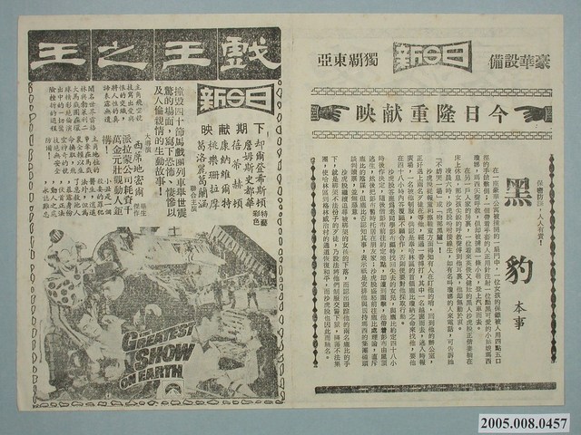 《巴黎落霧》電影廣告單單張兩面,外觀保存良好,黑色印刷,紙張泛黃。 半面是日新戲院「黑豹」本事、另半面是「戲王之王」簡介。背面《巴黎落霧》電影宣傳。 《巴黎落霧》(La maison sous les arbres (法文原文)The Deadly Trap(英譯)(1971))。當她的計算機天才男友因不明原因決定辭去大公司的工作時,吉爾感到驚訝和憤怒。但是,當她的孩子神秘地消失並且似乎被綁架時,她想知道更多,並發現她可能陷入了嚴重的陷阱......