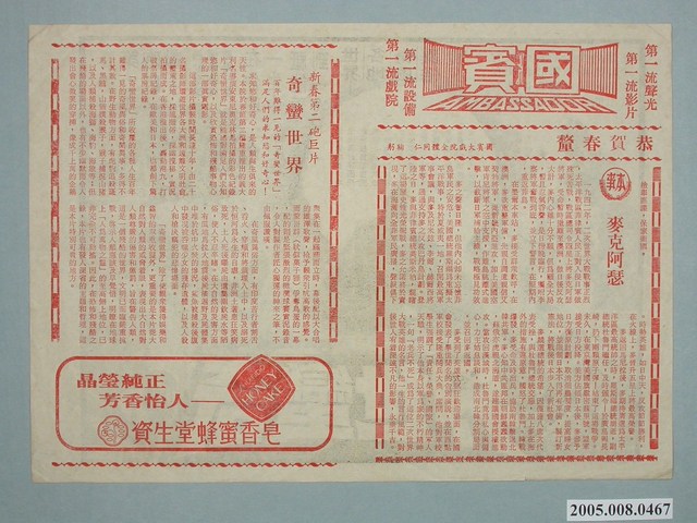《奇蠻世界》電影廣告單單張兩面,外觀保存良好。 半面是國賓戲院「麥克阿瑟」本事、另半面是《奇蠻世界》簡介,紅色印刷。背面為《奇蠻世界》電影宣傳,黑色印刷。 《奇蠻世界》(Savana violenta(意大利原文)This violent world(英譯)(1976))。世界風俗、生態環境記錄片。