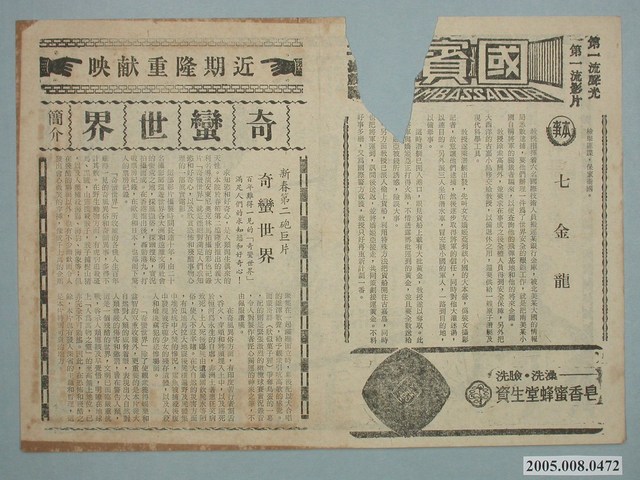 《麥克阿瑟》電影廣告單單張兩面,黑白印刷,外觀保存不佳,上緣中間有一倒三角型缺口約上邊1/6寬、側邊的1/3高,無法辨認部份失去的字,紙質泛黃。 半面是國賓「七金龍」本事、另半面是「奇蠻世界」簡介。背面為《麥克阿瑟》電影宣傳。 《麥克阿瑟》(MacArthur (1977))。道格拉斯麥克阿瑟將軍的傳記報導了他在二戰和朝鮮戰爭期間的戰爭情況。