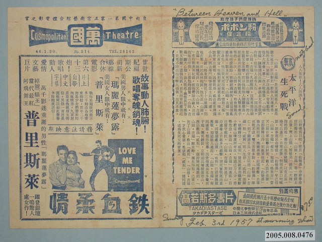 《河孃淚》電影廣告單單張兩面,外觀保存良好,紙張泛黃。 半面是「太平洋生死戰」本事,有深藍色筆跡、另半面是萬國「鐵血柔情」簡介,藍色印刷。背面為《河孃淚》電影宣傳,紅色印刷。 《河孃淚》(La donna del fiume (意大利原文)Woman of the river(英譯)(1954))。當農民女孩Nives被走私者Gino Lodi遺棄時,她背叛了他的警察。喜歡Nives的警察Enzo Cinti將她追踪到Po河的甘蔗田,在那裡她作為一名支持自己和嬰兒的工具,並警告她Gino已逃出監獄並正在尋