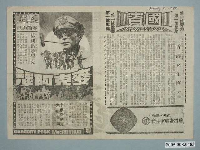 《七金龍》電影廣告單單張兩面,黑白印刷,外觀保存良好。 半面是國賓「香港女伯爵」本事,上方有藍色原子筆標日期「January 9,1978」、另半面是《麥克阿瑟》簡介。背面為《七金龍》電影宣傳。 《七金龍》(Il grande colpo dei 7 uomini d'oro (法文原文)seven golden men strike again(英譯)(1966))。教練(Leroy)及其手下的男子在一次火車搶劫案中被美國特工抓獲。為了避免坐牢,他們必須綁架一名拉丁獨裁者。