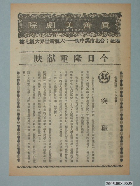 本件保存良好,為真善美戲院出品,克里絲的噩夢電影廣告單。由瑪麗莎、珍茜寶(Jean Seberg)主演。廣告單上標示:金獎影后珍茜寶因演本片驚駭刺激過劇不幸病逝。本片為其真正最後遺作。本電影1973年於西班牙上映,1980年於台北上映。