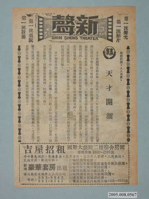 本件保存良好,為黑白雙面印刷,為電影東征任務電影單。由喬治馬丁、嵐東十郎、中村聖子主演。電影宣傳為忍術、柔道、空手道、武士道大對決!、日本藝妓春色無邊!溫柔醉人迷、全部日本實景拍攝!東京風光一覽無遺。電影單背面為天才開溜宣傳。右側有「保密防諜人人有責」字樣。下方有房屋出租廣告。
