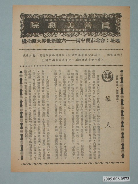 本件保存良好,為黑白雙面印刷,為電影歌聲淚痕The Rose電影單。由貝蒂蜜勒Bette Midler、亞倫貝茲Alan Bates、弗瑞福斯特Frederic Forrest主演,導演Mark Rydell。電影單背面為象人宣傳。