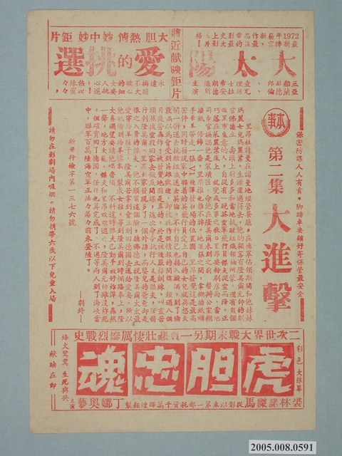 本件保存良好,為單色雙面印刷,為電影殘愛電影單。電影宣傳為1972年日本出版性愛知識手冊搬上銀幕,震驚全球傲視影壇大問題大作品,片刻情愛終身恨此恨綿綿雙淚垂,寫盡現實男性的情慾寫盡現實女性的苦悶。電影單其他部分為大進擊第二集宣傳。