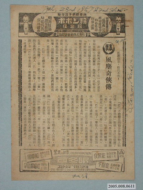 本件保存良好,為黑白雙面印刷,為電影電腦風雲Desk Set 電影單。由史本賽屈賽 Spencer Tracy、凱瑟琳赫本 Katharine Hepburn主演,導演 Walter Lang。電影單其他部分為風塵奇俠傳宣傳。
