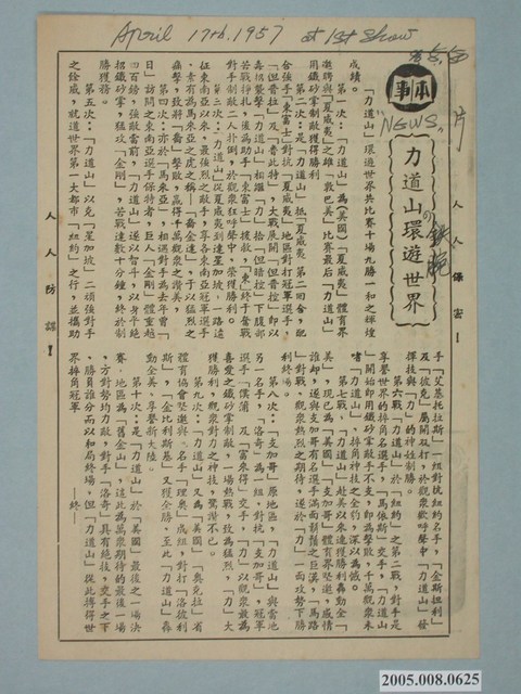1.臺北中央戲院1957年提供觀眾的電影本事,雙面印刷,一面其上寫有字跡標註「1957. April. 17」、「news片」、「鐵腕」等字樣。一面是本期上映的《力道山環遊世界》的電影本事,描述摔角選手力道山參加世界比賽九勝一和的輝煌成績;推測該片為1957年由相模映畫社製作的日本片。而另面則是下期上映的兩部電影文案廣告,包括《新天方寶盒》的電影本事,描述八達城王位繼承人茜娜挑選夫婿的故事;以及由羅門光三郎、阪東好太郎等主演的日本片《孫悟空》。