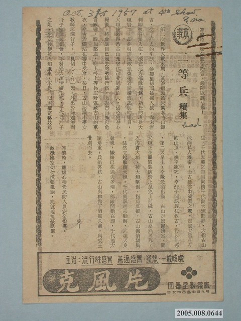 本件保存良好,為單色雙面印刷,為電影江戶城風流記 絵島生島電影單。由淡島千景、高峰三枝仔、三宅邦子、高橋貞二主演。導演大庭秀雄。電影單其他部分為二等兵 續集宣傳。