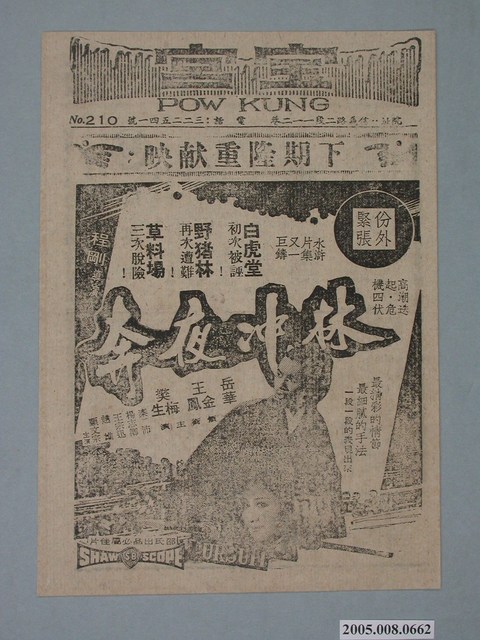 本件保存良好,為黑白雙面印刷,為電影林沖夜奔電影單。由岳華、王金鳳、樊梅生主演,導演程剛。電影宣傳為白虎堂初次遭誣!野豬林再次遭難!草料場三度脫險!。電影單其他部分為群英會、大軍閥宣傳。