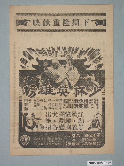本件保存良好,為黑白雙面印刷,為電影少林英雄榜電影單。由羅烈、李麗麗、徐少強、顧冠忠主演,導演何夢華。電影單其他部分為絕代雙嬌宣傳。