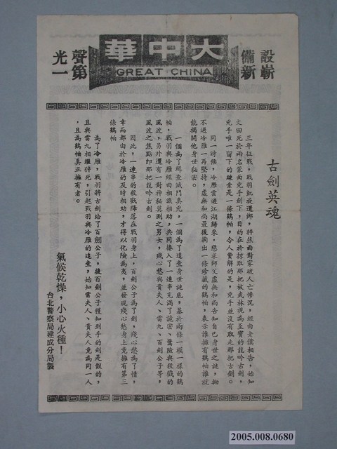 本件保存良好,為黑白雙面印刷,為電影百戰保山河電影單。由柯俊雄、龍君兒、羅烈、陳秋燕、孟飛主演,導演程剛。電影單其他部分為古劍英魂宣傳。