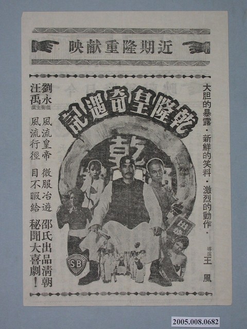 本件保存良好,為黑白雙面印刷,為電影乾隆皇奇遇記電影單。由劉永、汪禹主演,導演王風。電影單其他部分為天涯明月刀宣傳。