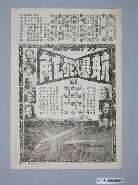 本件保存良好,為黑白雙面印刷,為電影航爆死亡角Airport '77電影單。由傑克里蒙 Jack Lemmon、李葛蘭Lee Grant、白蘭黛維卡洛Brenda Vaccaro、約瑟夫考頓Joseph Cotten、奧莉薇哈佛蘭Olivia de Havilland、戴利麥蓋文 Darren McGavin、克里斯多夫李Christopher Lee、喬治甘迺迪George Kennedy、詹姆史都華James Stewart主演,導演傑瑞詹遜 Jerry Jameson。電影單其他部分為美人如玉劍如虹
