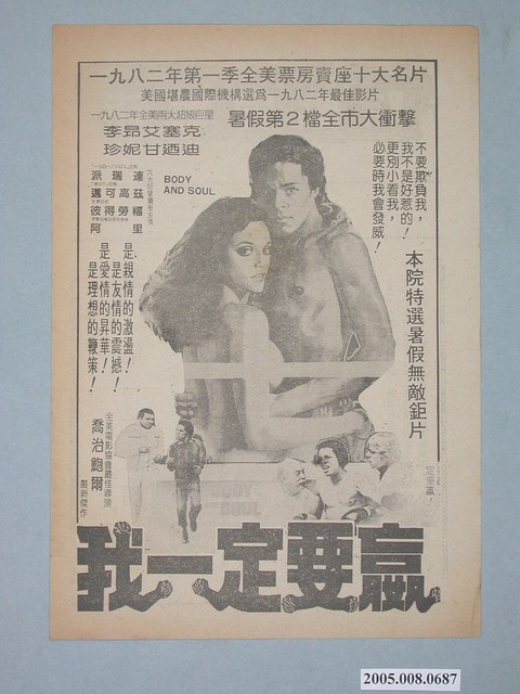本件保存良好,為黑白雙面印刷,為電影我一定要贏Body and Soul電影單。由李昂艾塞克Leon Isaac Kennedy、珍妮甘迺迪Jayne Kennedy主演,導演喬治鮑爾George Bowers。電影單其他部分為第一次接觸宣傳。