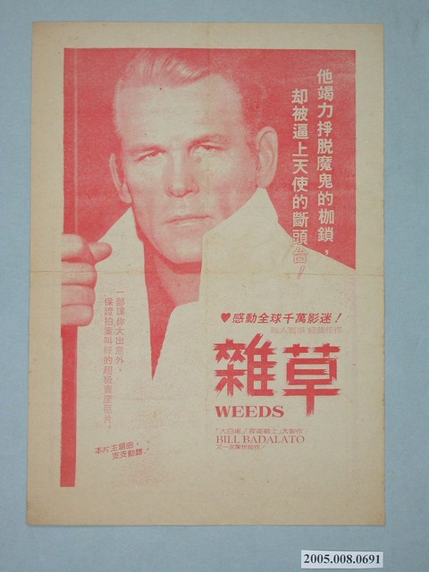 本件保存良好,為單色雙面印刷,為電影雜草 Weeds電影單。由Nick Nolte主演,導演John Hancock。電影宣傳為他竭力掙脫惡魔的枷鎖,卻被逼上天使的斷頭台。電影單其他部分為激情劊子手宣傳。