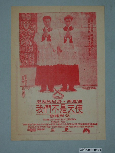 1.臺北忠孝戲院1989年左右提供觀眾的電影本事,雙面印刷。一面為美國片《當哈利碰上莎莉》(When Harry Met Sally...)的電影本事,該片描述哈利與莎莉這對男女原本對愛情及人生的態度分歧,到逐漸彼此滋生愛情的故事,是一部愛情喜劇電影。另面則是《我們不是天使》(We're No Angels)的電影劇照及文案廣告,該片由知名影星勞勃迪尼洛、西恩潘、黛咪摩兒主演,描述兩位被迫逃獄的重刑犯,暗藏教堂裡成為假傳道士的故事。