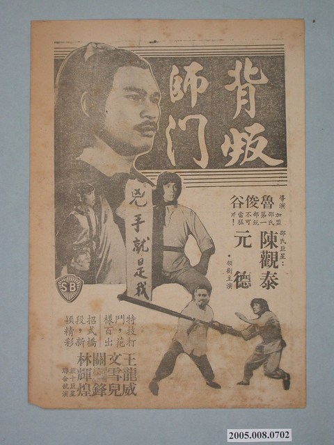 本件保存良好,為黑白雙面印刷,為電影背叛師門電影單。由元德、陳觀泰主演,導演魯俊谷。電影單其他部分為倚天屠龍記宣傳。
