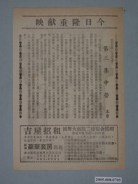 本件保存良好,為黑白雙面印刷,為電影金枝玉葉電影單。由凌波、張艾嘉、趙雷、紐方雨、葛香亭主演,導演金漢。電影單其他部分為火第三集中營宣傳。