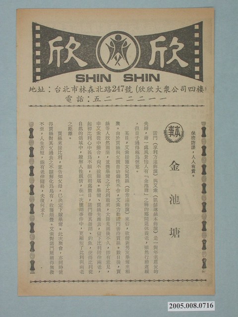 電影廣告單《飛越奪命橋》直幅單張雙面黑色印刷,外觀保存良好。 一面是欣欣戲院「金池塘」本事。一面是《飛越奪命橋》電影宣傳海報。 《飛越奪命橋》(The Cassandra Crossing (1976))。歐洲火車上的乘客已經暴露於致命疾病。沒有人會讓他們下車。接下來會發生什麼?