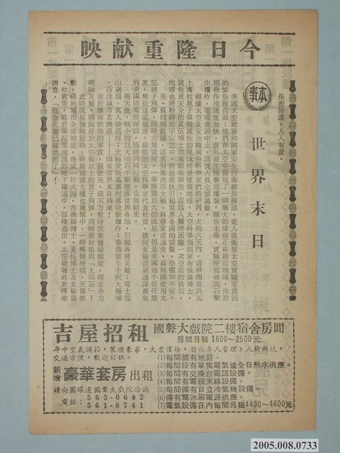 電影廣告單《誰之罪》直幅單張雙面黑色印刷,外觀保存良好。 一面是「世界末日」本事。一面是《誰之罪》電影宣傳海報。 《誰之罪》。「大法師、誰之過最佳演技少女紅星 琳達白麗兒 最新之作」「誰之過 姊妹作」
