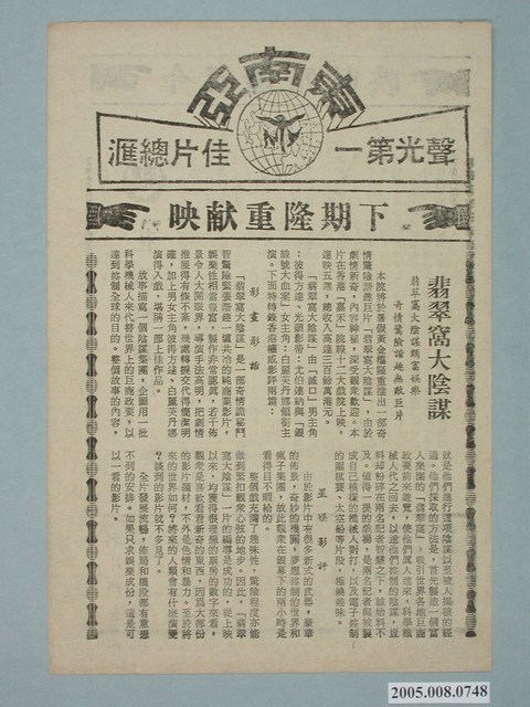 1.臺北東南亞戲院1970年代提供觀眾的電影本事,雙面印刷。一面為美國片《花蕊戀春風》(Rome Adventure)的電影本事,該片描述一群俊男美女在義大利羅馬城所發生的愛情故事。另面則是下期上映的美國片《翡翠窩大陰謀》(Futureworld)影評介紹及文案廣告,強調該片由彼得方達、尤伯連納、白麗芙丹娜等主演,是一部充滿奇情驚險的科幻電影。