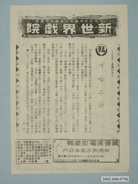 電影廣告單《六犬大盗》直幅單張雙面黑色印刷,外觀保存良好。 一面是新世界戲院「哼哈二將」本事。一面是《六犬大盗》電影宣傳海報。 《六犬大盗》(The Doberman Gang (1972))。在銀行搶劫失敗之後,一名前騙子,一名前女服務員和他們的一些朋友訓練了一包杜賓犬,為他們搶劫銀行。