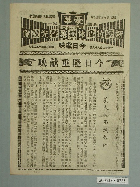 電影廣告單《航爆死亡角》直幅單張雙面黑色印刷,外觀保存良好。 一面是豪華戲院「美人如玉劍如虹」本事。一面是《航爆死亡角》電影宣傳海報。 《航爆死亡角》(Airport '77 (1977))。藝術小偷劫持了一架747,撞上了大霧並撞向海洋,將他們和乘客困在一百英尺深的水下。