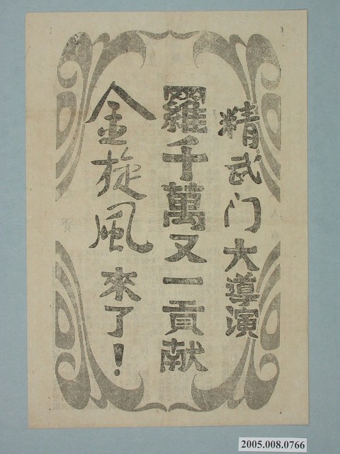 1.臺北國泰、明星、華聲戲院1970年代提供觀眾的電影本事,雙面印刷。一面為臺灣電影《無價之寶》的電影本事,該片為1972年陳耀圻執導的愛情喜劇,描述一女子為尋找祖父遺留的一件夾克所引發之一連串愛情及親情故事。另面則是《金旋風》的電影文案廣告,該片為《精武門》導演羅千萬(羅維)所執導的古裝片。