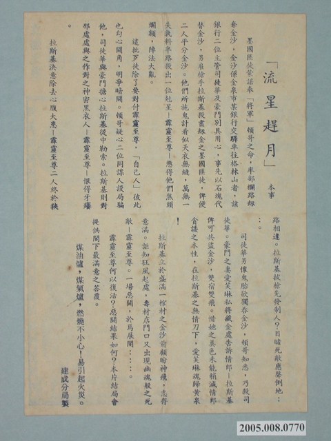 電影廣告單《青樓艷妓》直幅單張雙面藍色印刷,外觀保存良好。 一面是「流星趕月」本事。一面是《青樓艷妓》電影宣傳海報。 《青樓艷妓》(BUtterfield 8 (1960))。一位曼哈頓的女僕與一位富有的已婚男子發生了悲慘的戀情。