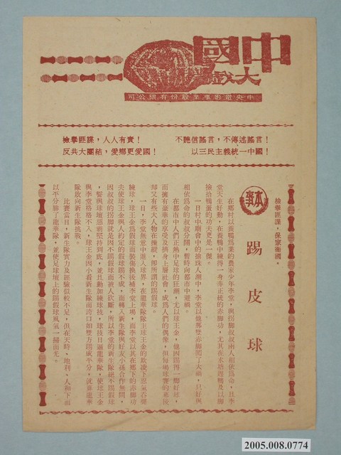 電影廣告單《危險人物》直幅單張雙面紅色印刷,外觀保存良好。 一面是中國大戲院「踢皮球」本事。一面是《危險人物》電影宣傳海報。 《危險人物》(1981)。貓仔(林國雄飾)與大貓(冼林旭飾)兩兄弟,大貓性愛女色;貓仔凶狠陰毒。二人在港,不務正業,終因犯罪入獄。獄中有積犯七叔(羅烈飾)乃黑社會大哥,對貓仔蠱惑和頑強之性格頗為賞識,將之收入門下。
