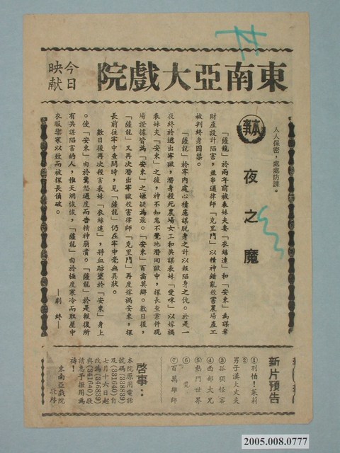 電影廣告單《最後一場電影》直幅單張雙面黑色印刷,有多筆藍筆記號,外觀保存良好。 一面是東南亞大戲院「夜之魔」本事。一面是《最後一場電影》電影宣傳海報。 《最後一場電影》(The Last Picture Show (1971))。1951年,一群高中生在一個荒涼,孤立,萎縮的西德克薩斯小鎮成長,在文化和經濟方面都在逐漸消亡。