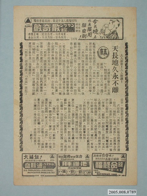 電影廣告單《藏械謀殺案》直幅單張雙面黑色印刷,外觀保存良好。 一面是「天長地久永不離」本事。一面是國際戲院《藏械謀殺案》電影宣傳海報。 《藏械謀殺案》(Count the Hours! (1953))。律師為被指控犯有兩起謀殺罪的移民工人辯護。