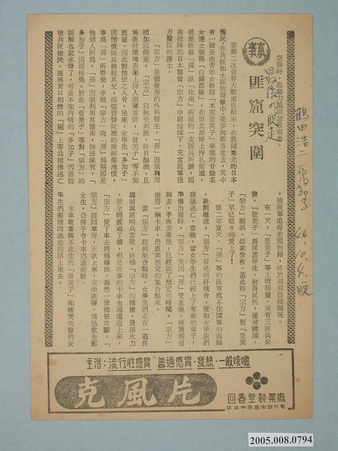 電影廣告單《江戶城風流記》直幅單張雙面黑色印刷,外觀保存良好。 一面是「匪窟突圍」本事。一面是台北大戲院「明治天皇與日俄戰爭」電影宣傳海報,及《江戶城風流記》電影宣傳。 《江戶城風流記》(絵島生島 (1955))。「寫盡深宮女的悲怨!江戶成時代的淫亂風流!」