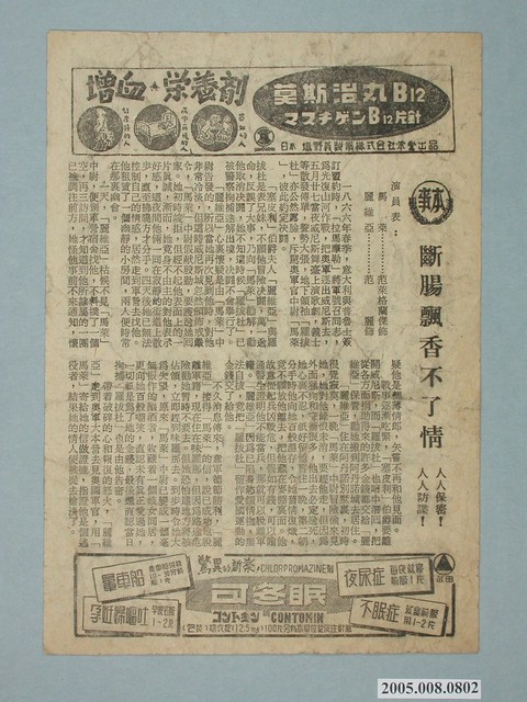 電影廣告單《戰地孽緣》直幅單張雙面黑色印刷,外觀保存良好。 一面是「斷腸飄香不了情」本事。一面是新生戲院《戰地孽緣》電影宣傳海報。 《戰地孽緣》(The Proud and Profane (1956))。在第二次世界大戰期間的太平洋地區,一位羅馬天主教寡婦為一名堅強的中校而戰。