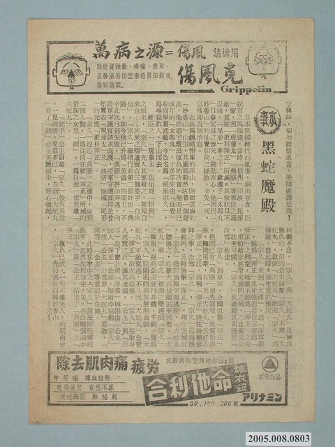 電影廣告單《黑沼紅顏》直幅單張雙面黑色印刷,外觀保存良好。 一面是「黑蛇魔墊」本事。一面是萬國戲院《黑沼紅顏》電影宣傳海報。 《黑沼紅顏》(Lure of the Swamp (1957))。Simon Lute勉強維持生活,向遊客租用小船,引導他們穿過迷宮般的河口。當一個神秘的陌生人要求他把他們深深地塞進沼澤地時,西蒙很好奇,特別是當這個男人要求獨自完成旅程的一部分時。
