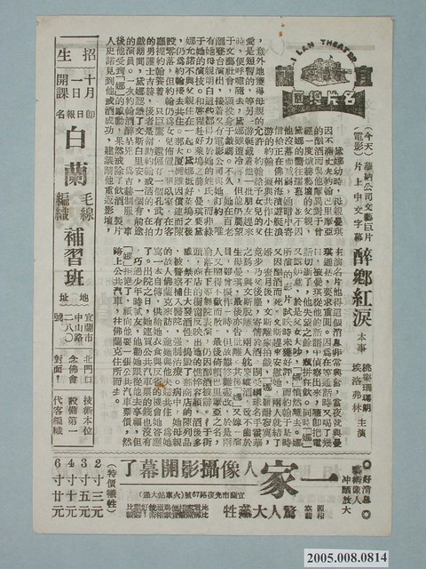1.本物件為宜蘭戲院宣傳單,紙質文物。該宣傳單上方可見「新芸綜合体電影」、「劍豪情史」字樣,中間為「噴火女郎」、「鄉下人從軍樂」宣傳廣告,下方為「國際照相館」宣傳廣告。背面右上角為「宜蘭 名片總匯」、「醉鄉紅淚」劇情介紹,左方為「白蘭毛線編織補習班」,下方為「一家人像攝影」開幕廣告。