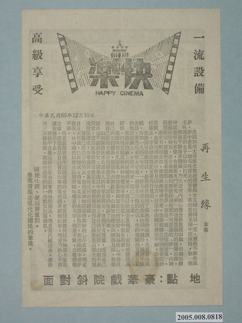電影廣告單《黃昏三鏢客 地獄決鬥》直幅單張雙面黑色印刷,外觀保存良好。 一面是快樂戲院「再生緣」本事。一面是《黃昏三鏢客 地獄決鬥》電影宣傳海報。 《黃昏三鏢客 地獄決鬥》(意大利原文:Il buono, il brutto, il cattivo(1966)、英譯:The Good, the Bad and the Ugly)。一場賞金的狩獵騙局與兩名男子在一場不安的聯盟中與三分之一聯盟,在一場比賽中尋找埋藏在偏遠墓地的黃金財富。