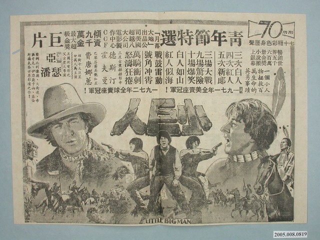 電影廣告單《列車大盗》直幅單張雙面黑色印刷,外觀保存良好。 一面右半是新聲戲院「大遊俠」本事,左半是《列車大盗》電影宣傳海報。一面是《小巨人》電影宣傳海報。 《列車大盗》(The Train Robbers (1973))。一位名叫萊恩的槍手被一位寡婦羅威夫人僱用,以找到她丈夫偷來的金子,以便她可以歸還並開始自由。